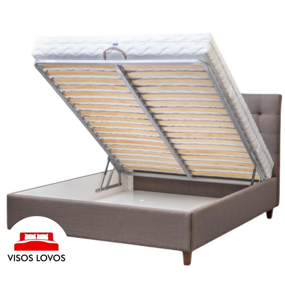 - Lovą su talpia patalynės dėže. Patogus čiužinio pakėlimo mechanizmas iš lovos galo leis patogiai pasiekti visą dėžės turinį. Įmontuotas pakėlimo mechanizmas leis pakelti čiužinį kartu su tvirtu metaliniu rėmu ir įmontuotomis grotelėmis.