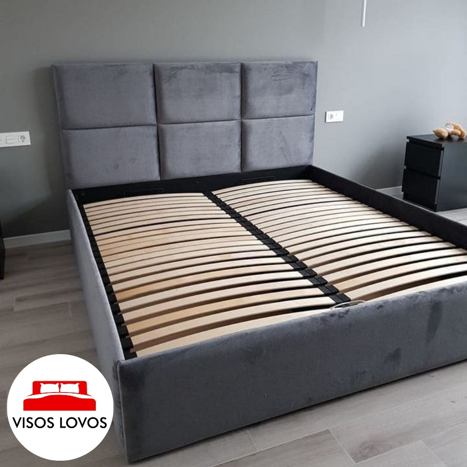 - Patalynės dėžė: Galime pagaminti su ir be patalynės dėžės. Patalynės dėžėje yra pertvara per vidurį. Lovos atlaiko 300 kg svorį, todėl lovos konstrukcijai suteikiame net 5 metų garantiją.